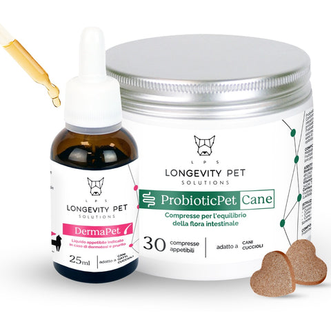 La “Soluzione Prurito Cane” di Longevity Pet è un percorso completo per il benessere intestinale e cutaneo del cane. Il kit include DermaPet, per la nutrizione e protezione della cute, e ProbioticPet, per l’equilibrio e l’immunità intestinale.